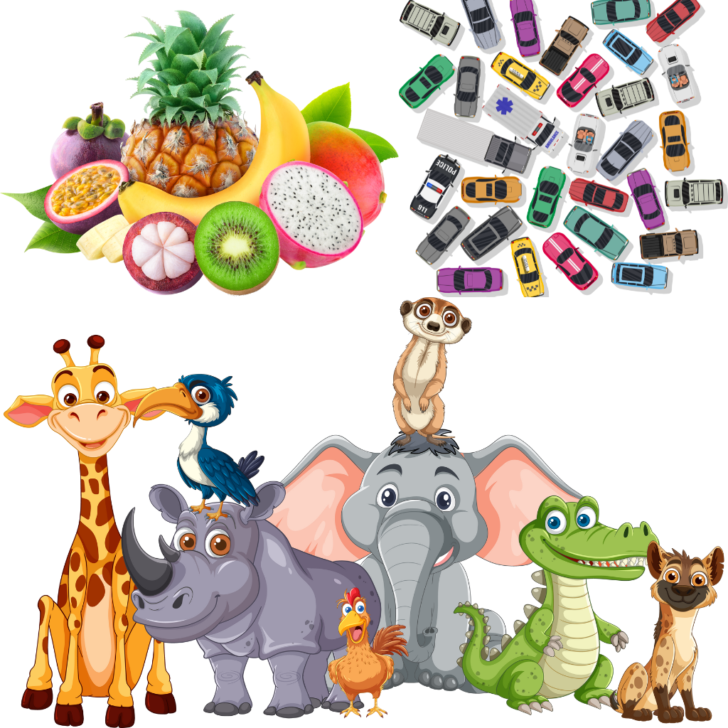 Themed Sections: Explore animals, fruits, vehicles & more.